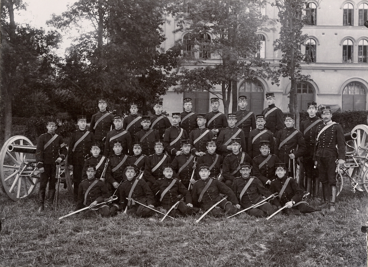 Titel: Grupporträtt av soldater vid Svea artilleriregemente A 1.
