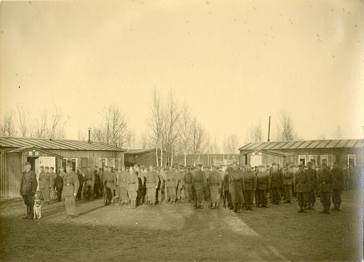 Titel: Beredskapskompani uppställt vid Moråsstugan med kapten Gunnar Åberg i spetsen 1942-1944.