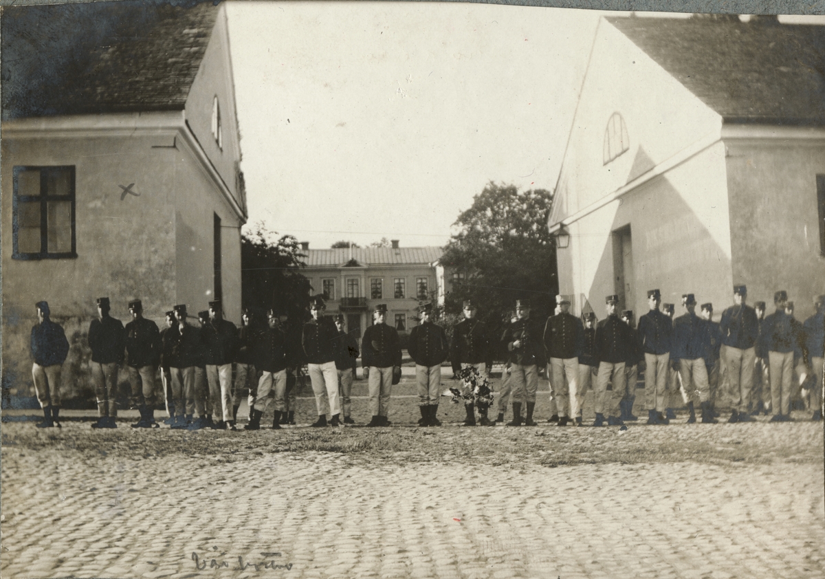 Titel: Soldater från Fortifikationen uppställda utanför byggnad.