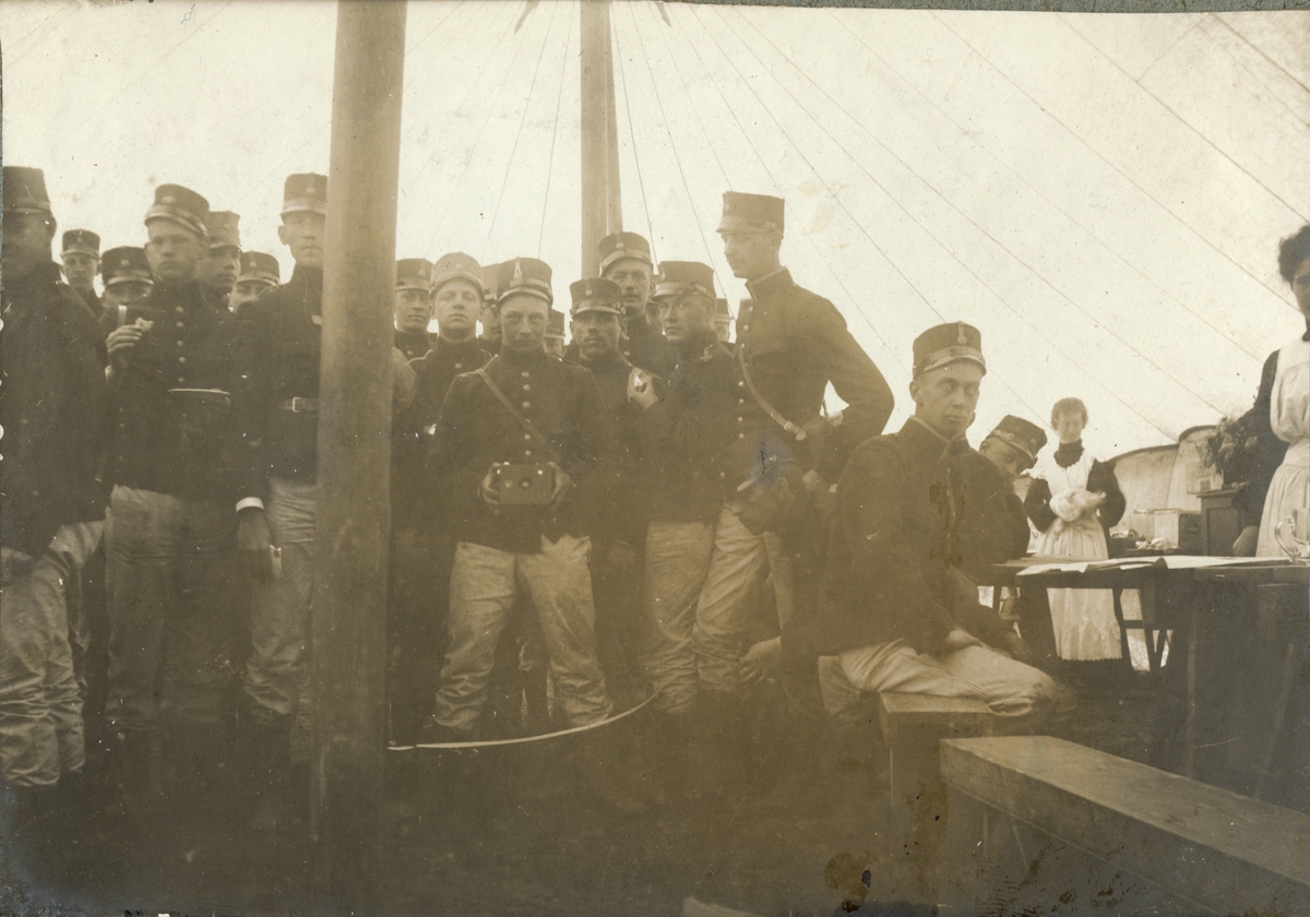 Titel: Soldater från Fortifikationen och två kvinnor (marketenterskor?) i ett tält.