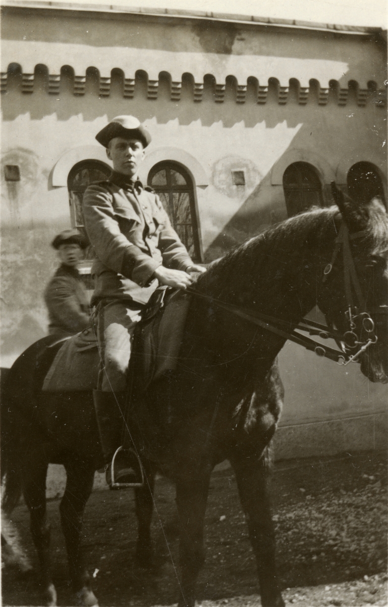 Text i fotoalbum: "Officersaspirantskolan 1925-1926. Ridutbildningen blev i början en svår stötosten, men så småningom blev man mer eller mindre sadelfast".