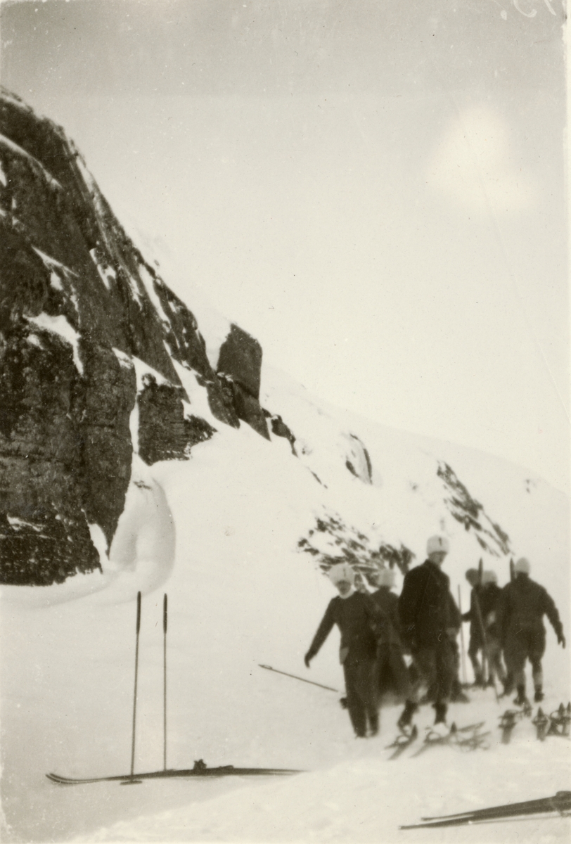 Text i fotoalbum: "Storlien febr. 1927. Fallet Victor. Vid en färd till Prinzschöldarnas sten norr Skurudalshöjden skedde en olycka då Victor ramlade ned från ett riksröse och bröt foten så illa att han fick sluta sin militära bana. Han forslades på en improviserad skidkälke den långa vägen till Storlien. Stupet där Victor ramlade ner".