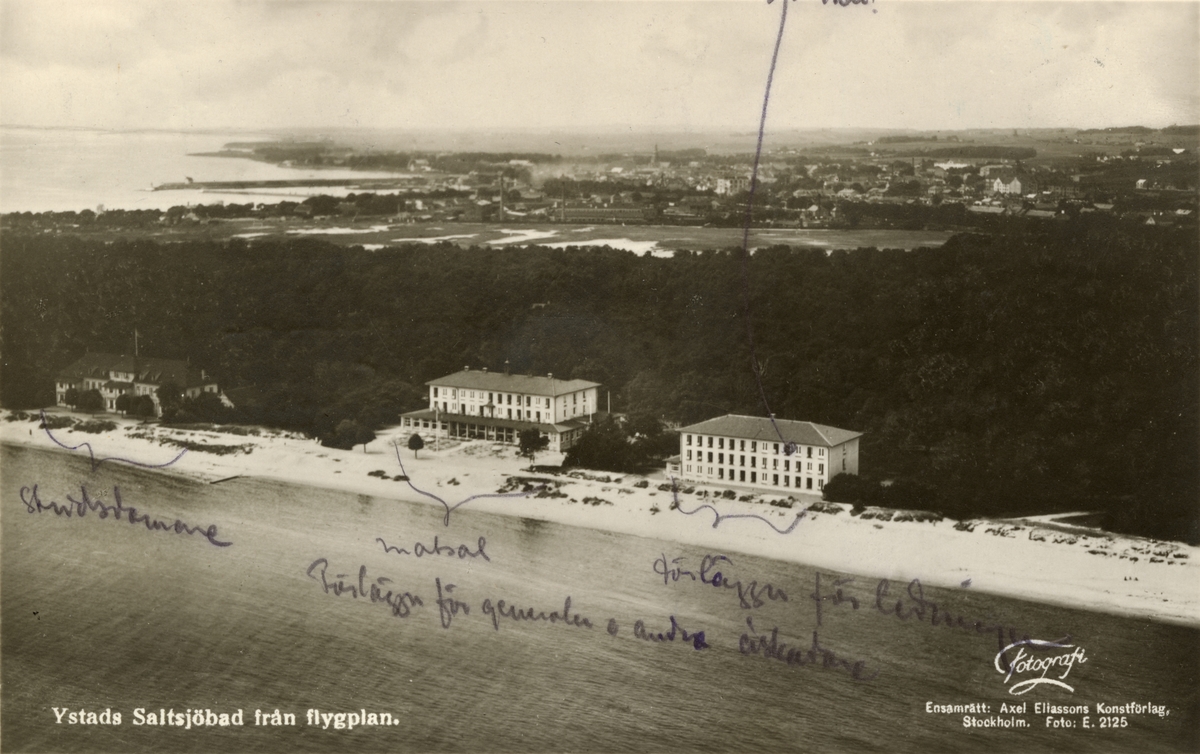 Titel: Text i fotoalbum: "1935. Okt. Skånemanövern. Högkvarterets förläggning. Ystads Saltsjöbad från flygplan".