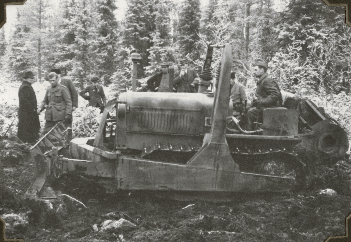 Text i fotoalbum: "Brytning av timmerbasväg med ingbat traktorer nov 1941, Dala-Floda skogar. "
