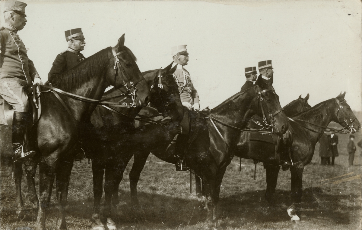 Titel: Text i fotoalbum: Staben åser förbimarschen för H. Maj:t Konungen den 1. september 1914.