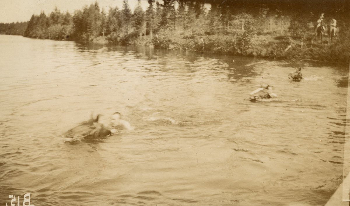 Titel: Simning med hästar över Piparbölesjön. Hästen "Kannibalen" längst fram.