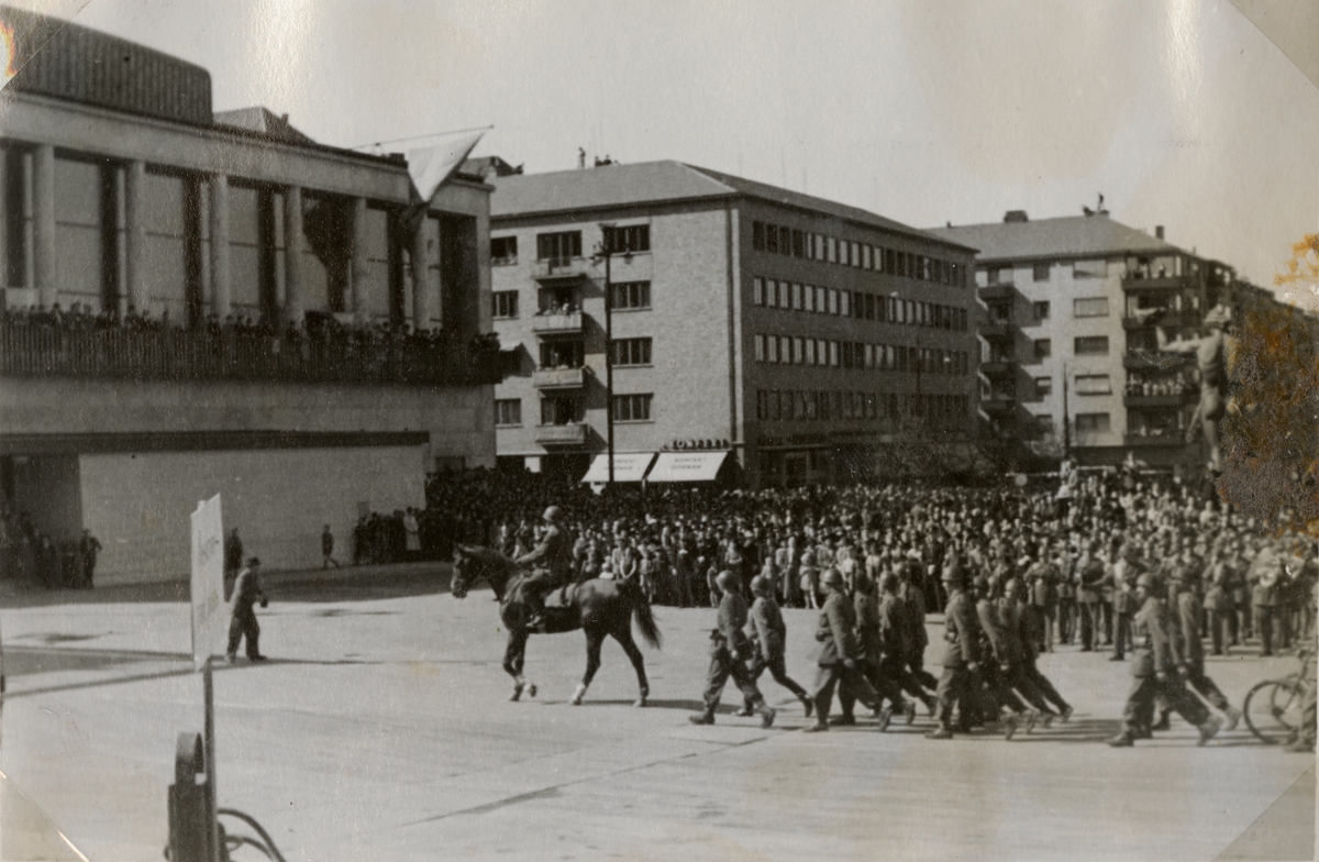 Titel: Text i fotoalbum: "Stora Militärparaden genom Göteborg 19/4 1942".