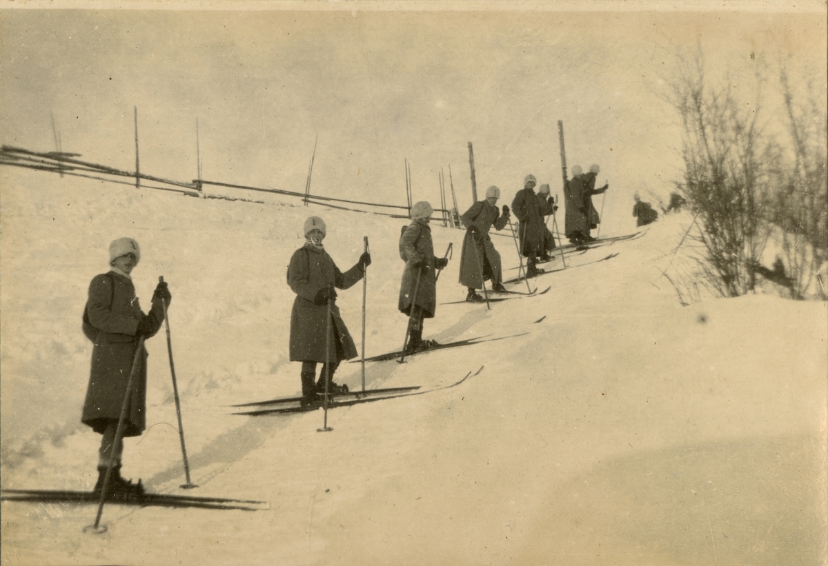 Titel: Gruppbild med soldater från Kavalleriskolan på skidor.