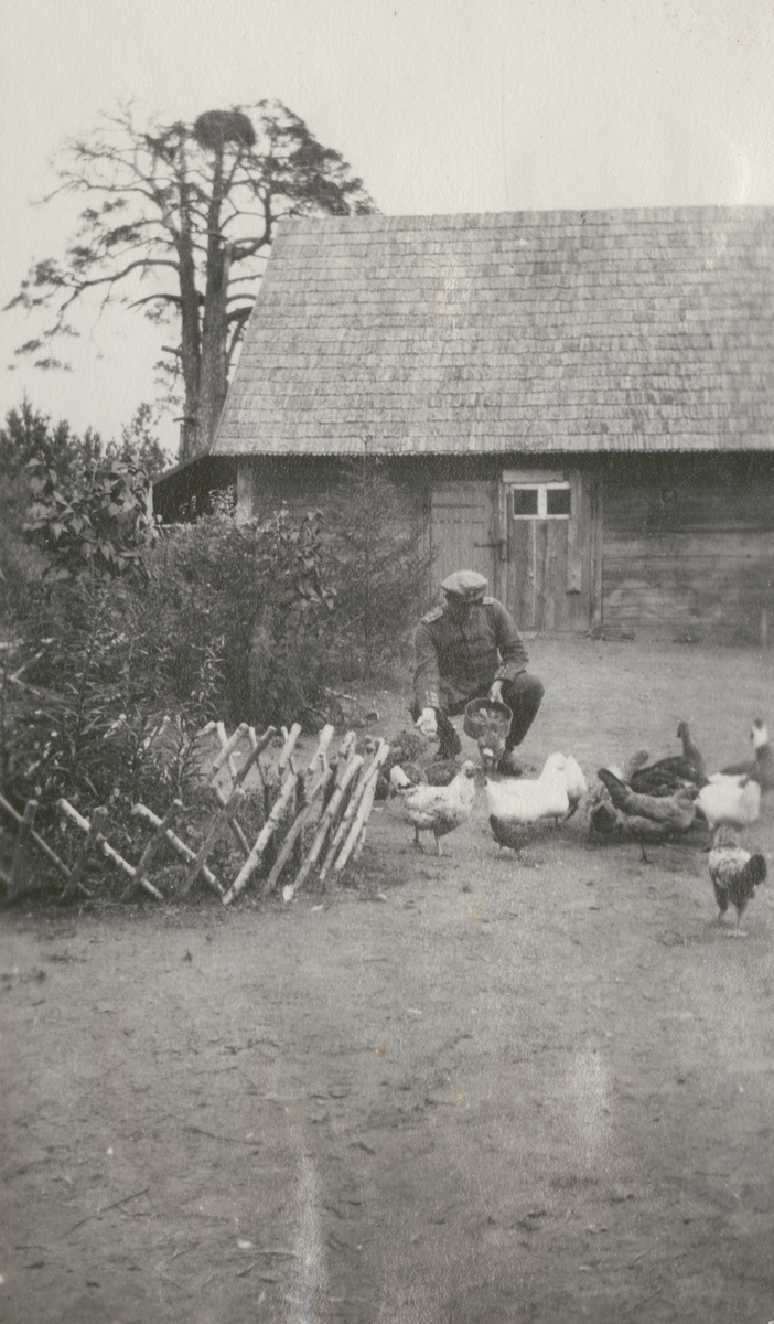 Text i fotoalbum: "Bataljonsadjutanten, Lt. Textor matar hönsen."