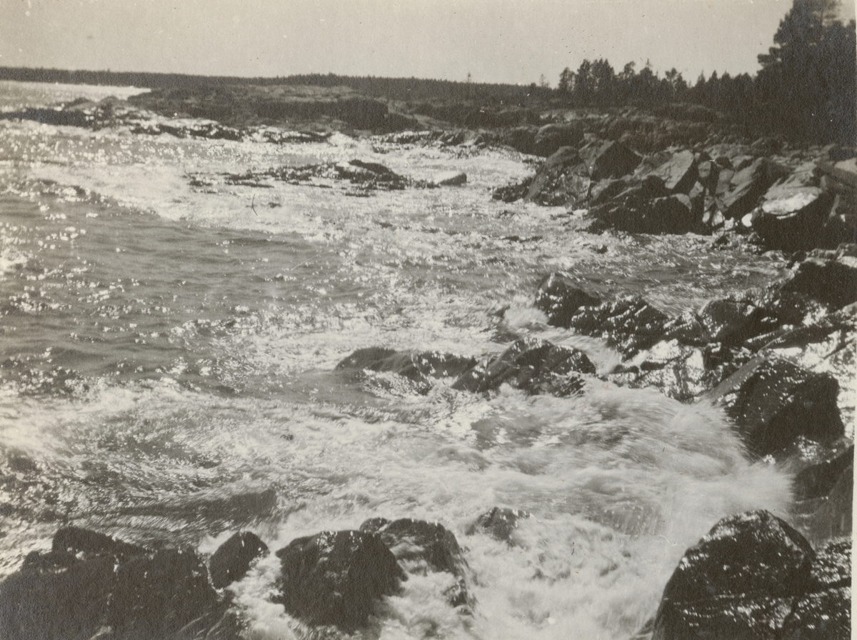 Titel: Naturbild på havet med vågor som slår mot strandklippor.
