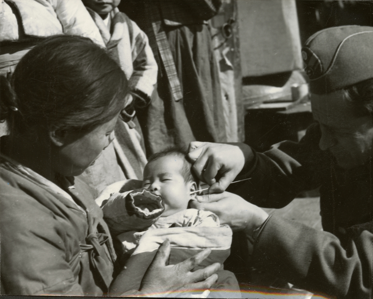 Titel: En kvinna med barn får hjälp militärsjukvård.