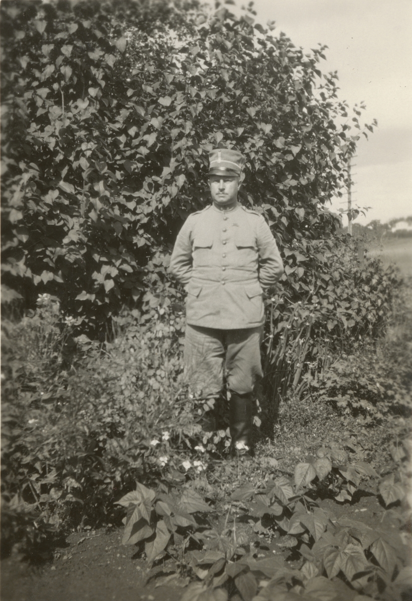 Titel: En soldat från Positionsartilleriregemente A 9 i en trädgård.
