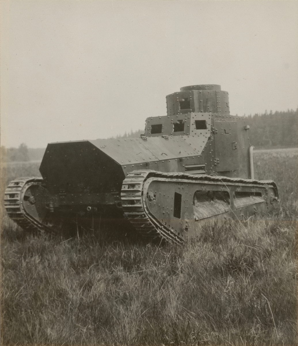 Titel: Fältövning med stridsvagn m/1921 (eller m/1921-1929). Göta livgardes stridsvagnsbataljon år 1929.