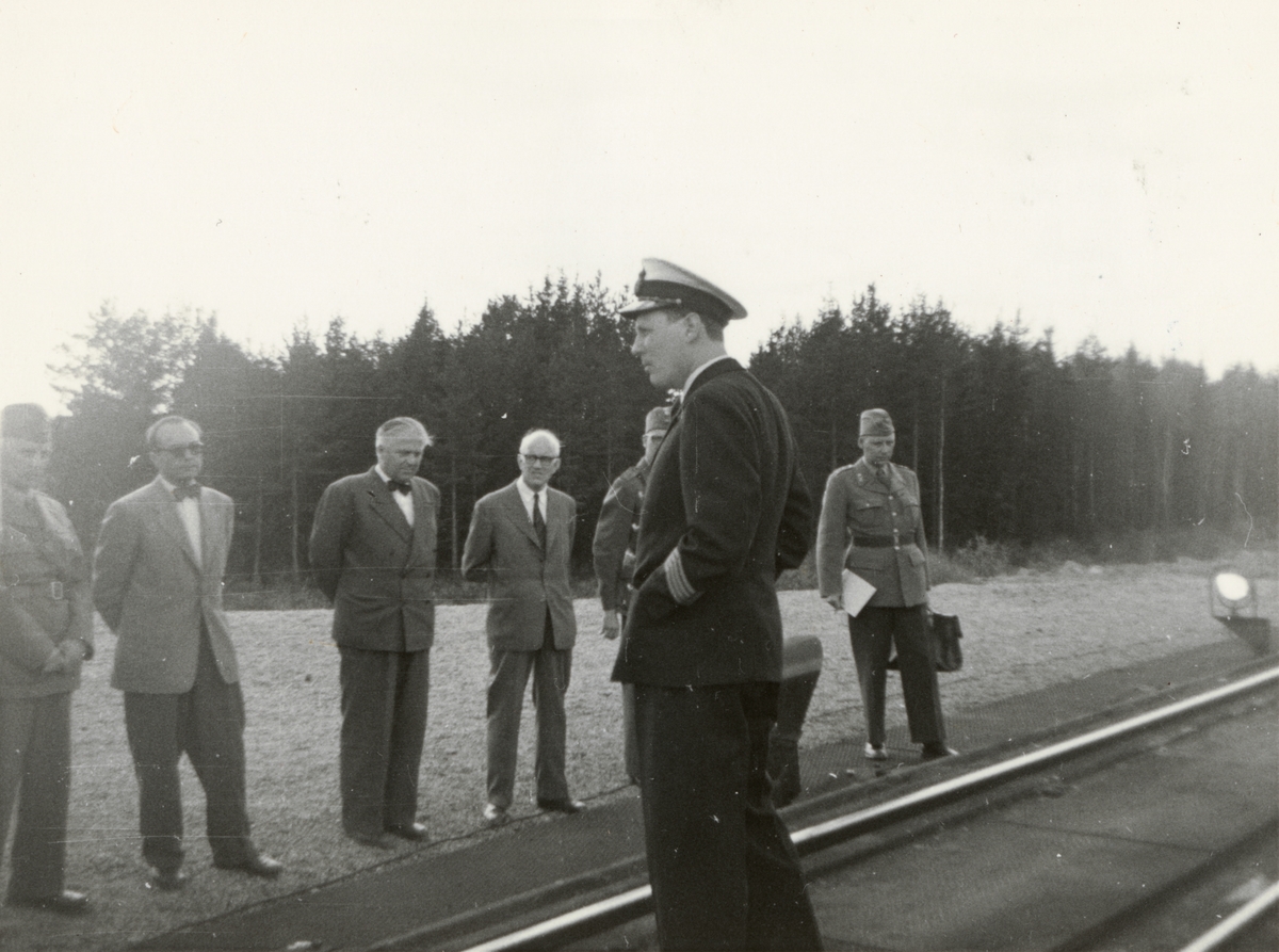 Titel: Text i fotoalbum: "FHS på marinfältövning 1956". Män vid järnväg.