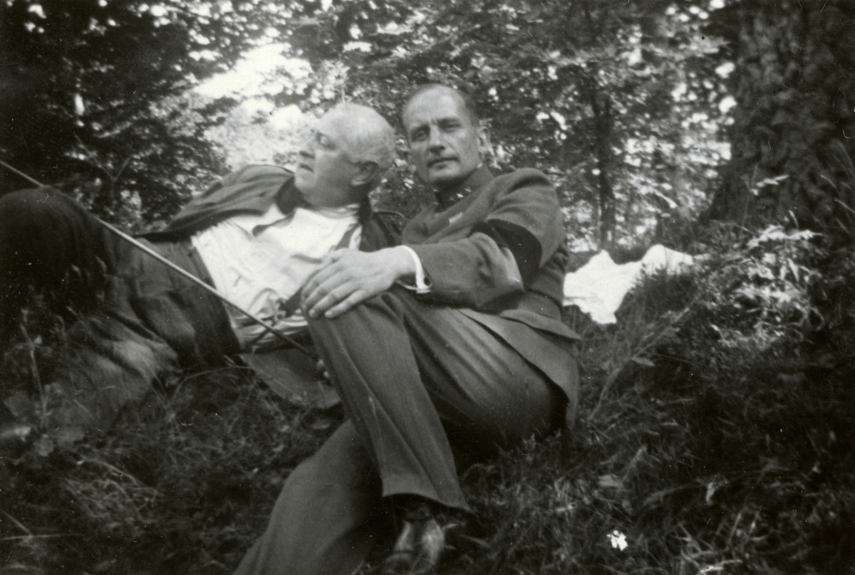 Text i fotoalbum: "1936 juni. Intendentur-fältövningen i Röstånga. Diskussion i det gröna. Bundy, Levin".