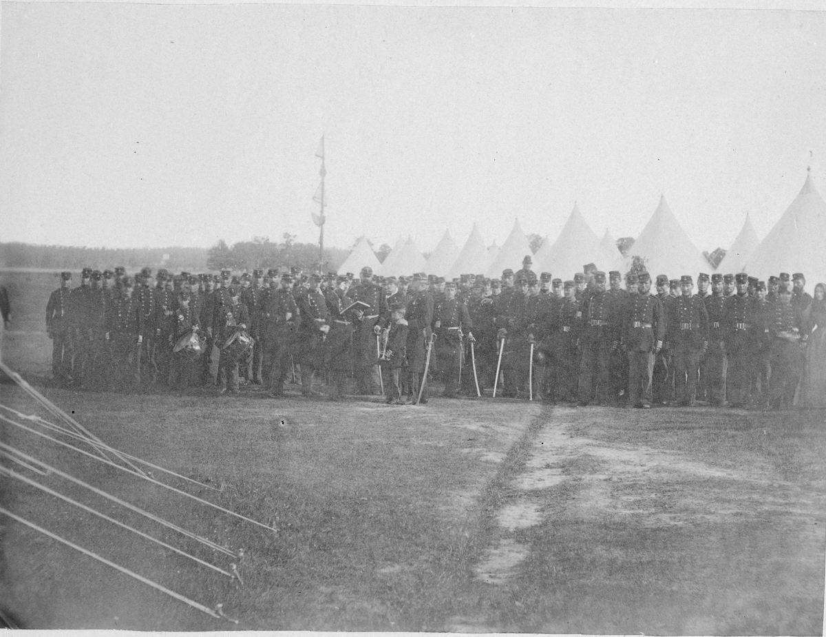 Soldater ur Västmanlands regemente I 18 uppställda utanför tält i lägret vid Utnäs löt efter ordernas uppläsande för dagen. Längst till höger i bild står en kvinna och längst fram tre trumslagarpojkar.