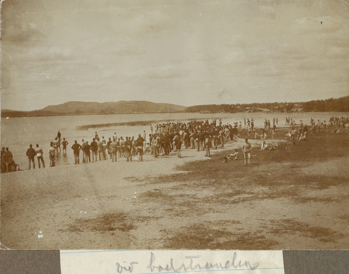 Soldater från Hälsinge regemente samlade på badstranden, troligtvis vid Florsjön.