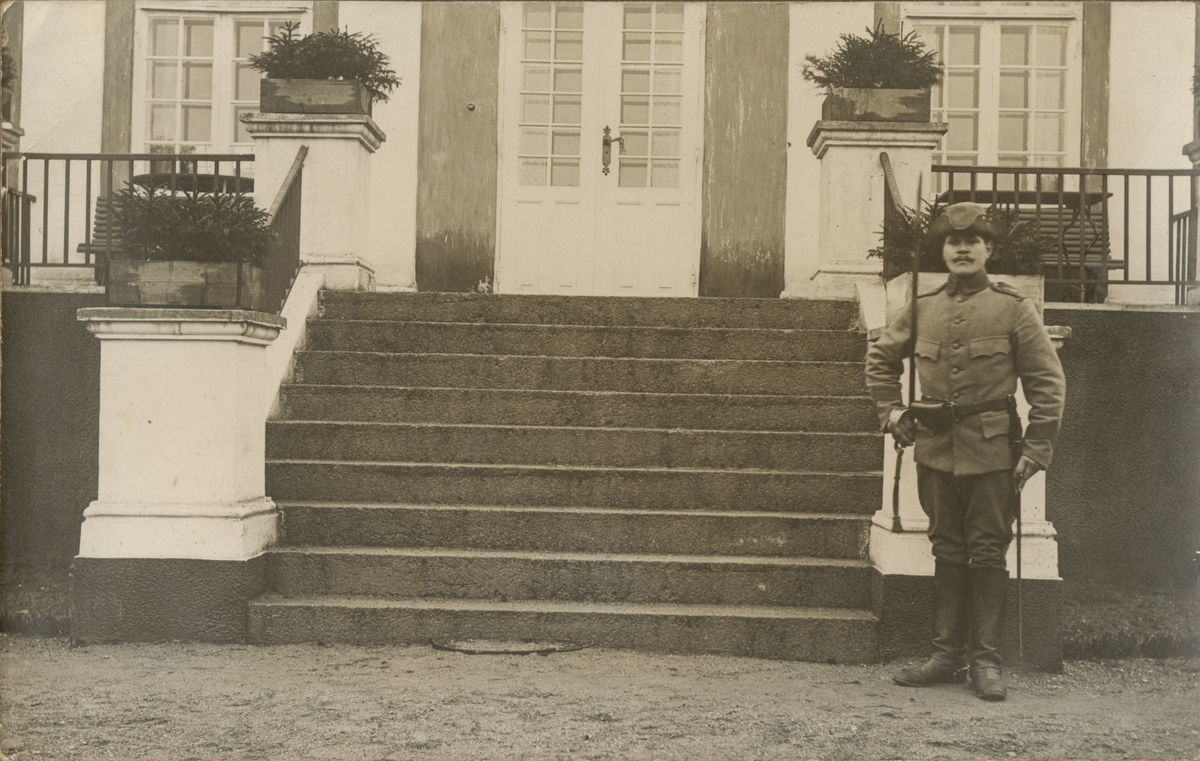 Titel: Soldater från Positionsartilleriregemente A 9 framför en byggnad.