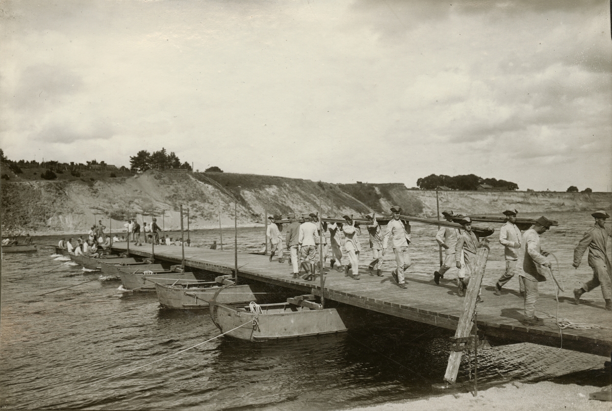 Titel: Elever från Krigsskolan Karlberg bygger pontonbro över vattendrag.
