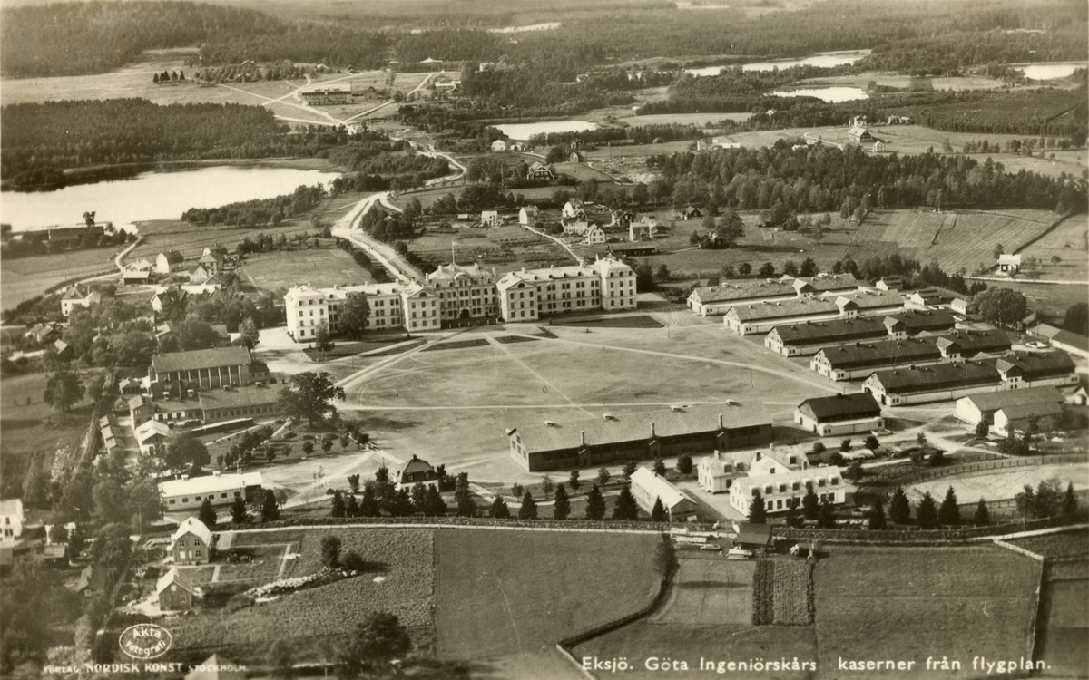 Titel: Text i fotoalbum: "Eksjö Ing 2. /3 1928-1/10 1929. Eksjö. Göta ingeniörskårs kaserner från flygplan."