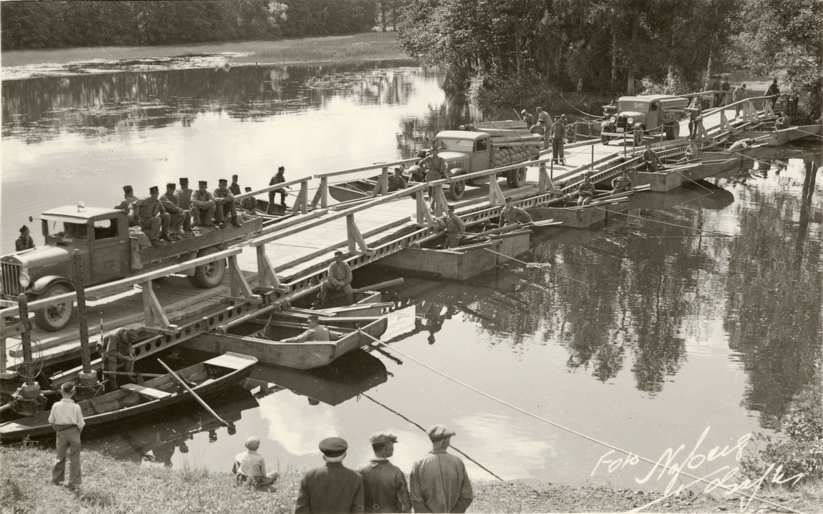 Text i fotoalbum: "Tung krigsbro vid Vestanå juli 1935".