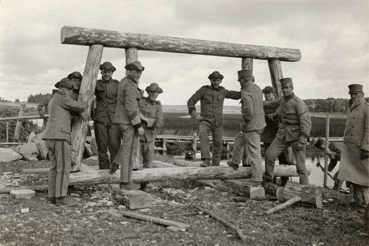 Titel: Text i fotoalbum: "Brobyggnad i Storvreta under mötet 1931. Snart började påloken bliva färdiga och då langade vi ut de tunga järnbalkarna, de största vägande 3 ton ".