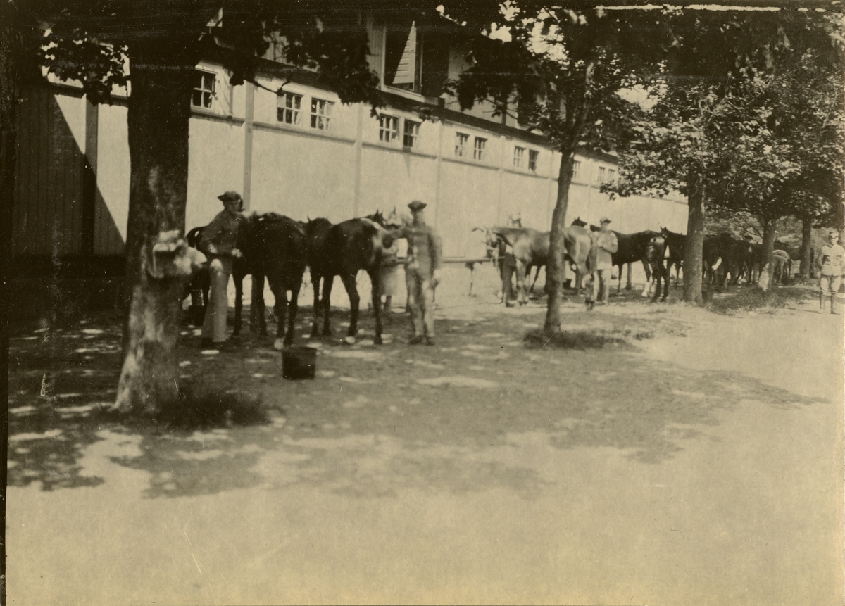 Titel: Soldater från Kavalleriskolan framför ridhuset.