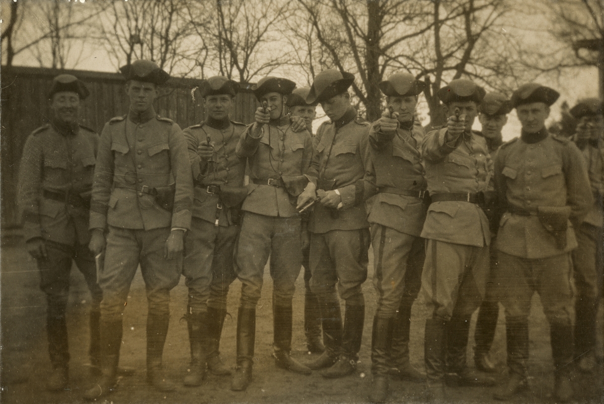 Titel: Soldater siktar med pistol.