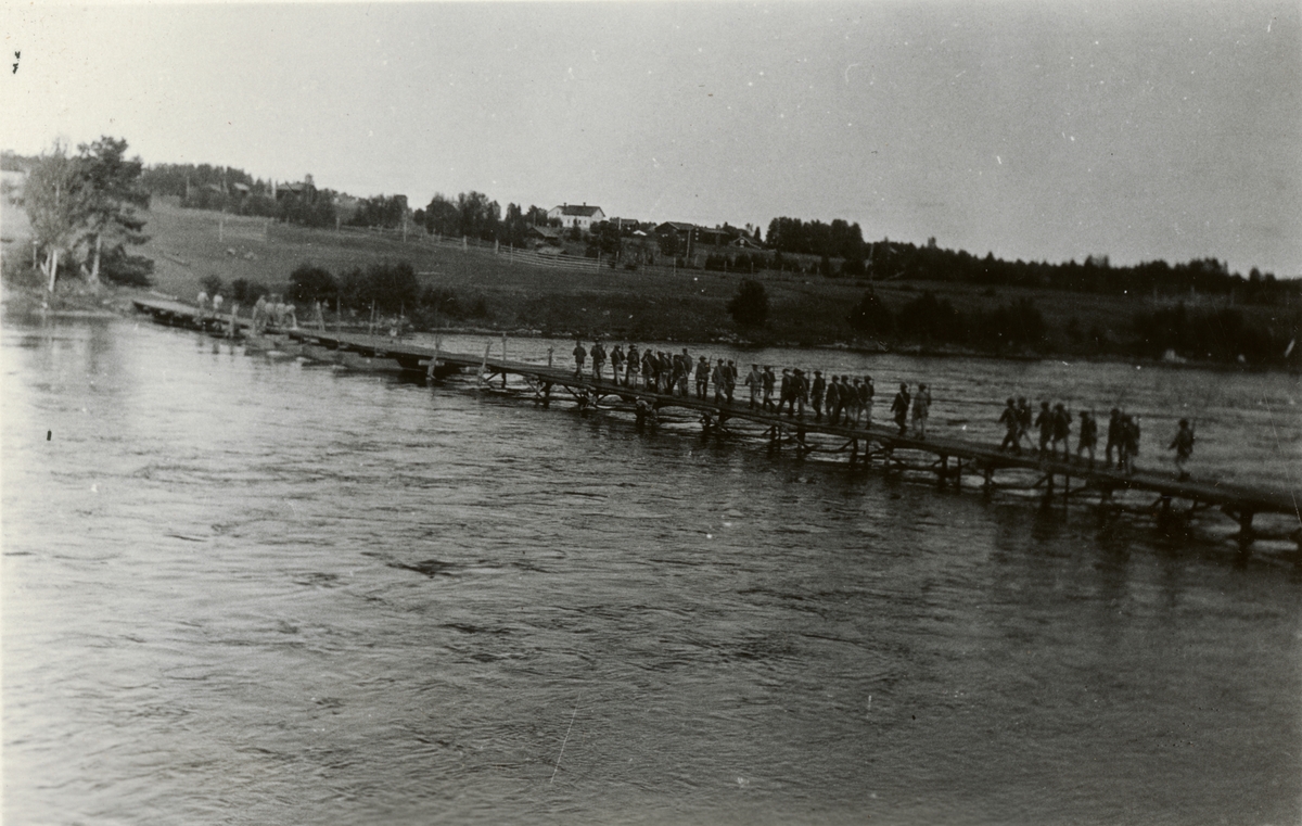 Text i fotoalbum: "Överskeppningsövningar i Lit 1929. Fältbro över älven".