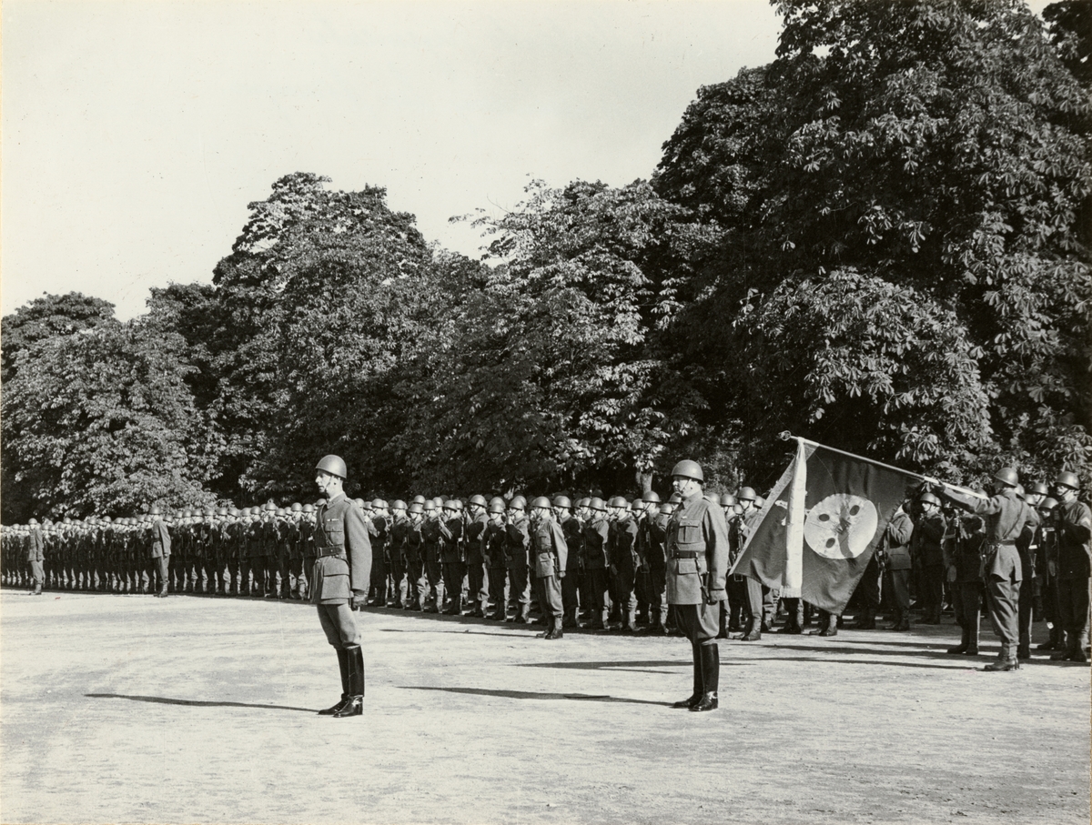Titel: Text i fotoalbum: "Fanöverlämning 27 september 1955. Regementet berett för avlämning till H M Konungen"