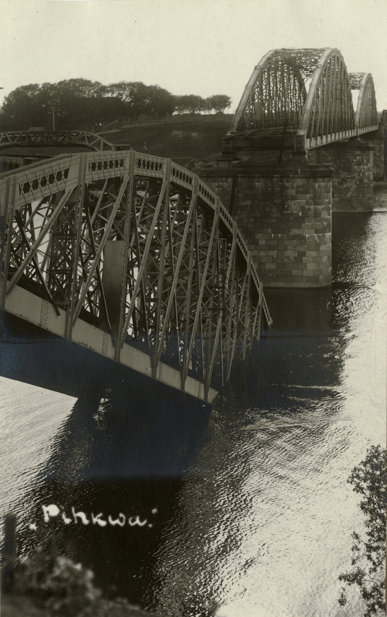 Titel: Text i fotoalbum: "Pleskau - järnvägsbro sprängd."