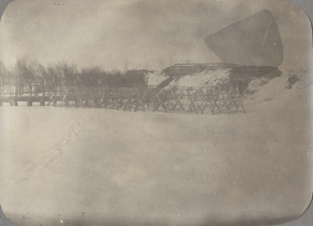 Text i fotoalbum: "Januari 1917. (då vi hade att uthärda svåra ryska anfall, Winterschlacht am der Aa). Olai ställningen. Hartigbron, endast nattetid passebar. Doppelgången, Unterstand för 16 man. Reserv af spanska ryttare för provisorisk reparation af sönderskjuten taggtrådstängsel."