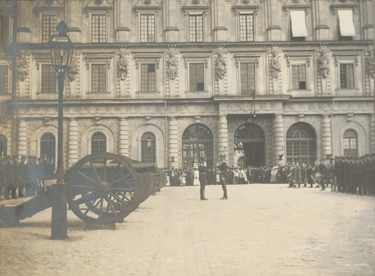 Text i fotoalbum: "Minnen från Storstrejkskommenderingen i Stockholm 1909. Vaktombyte på Kungl. slottet mellan Vestgöta och Jönköpings rgt:n."