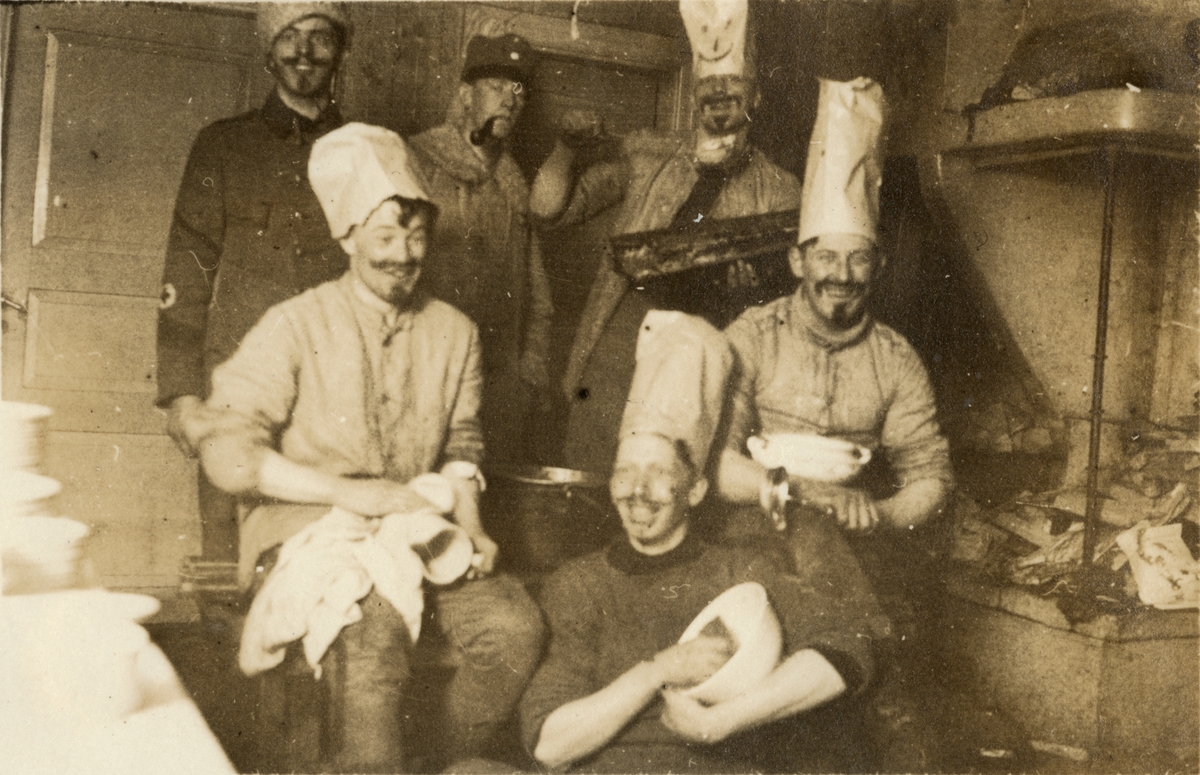 Text i fotoalbum: "Aspirantskolans vinterövningar i Björnänge febr.-mars 1926. Mer eller mindre frivillig köks handräckning ".
