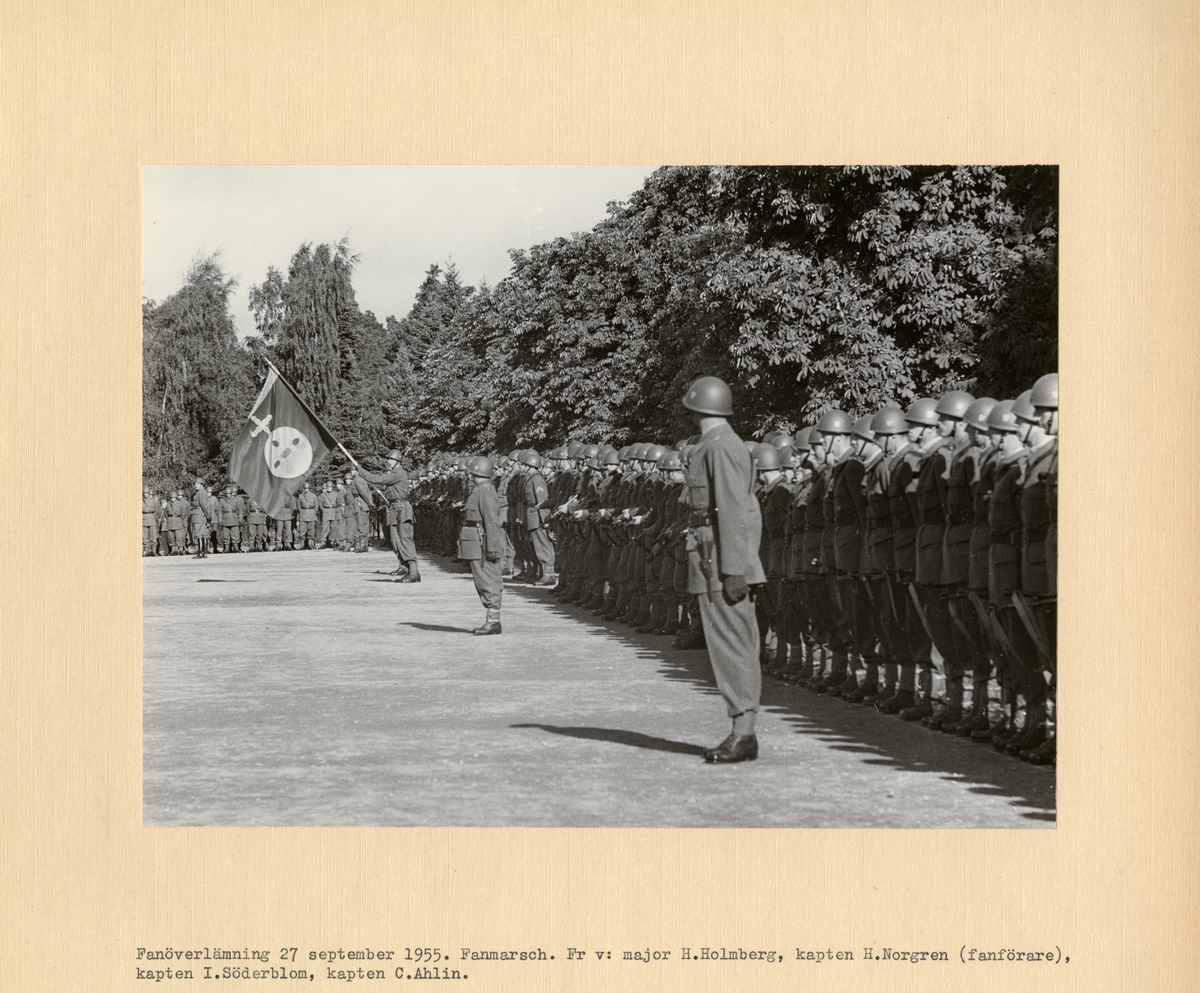 Titel: Text i fotoalbum: "Fanöverlämning 27 september 1955. Regementet berett för avlämning till H M Konungen"