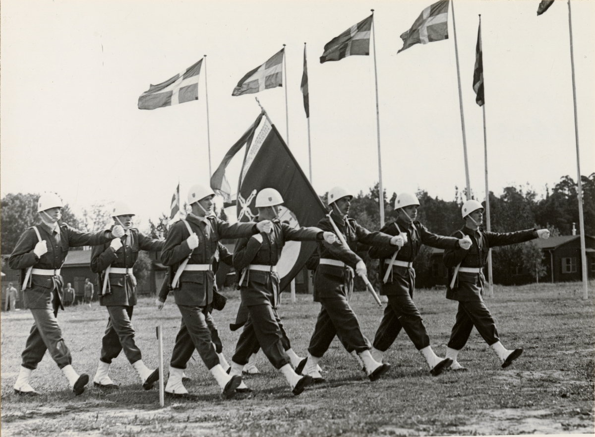 Titel: Text i fotoalbum: "Regementsfanan med fanvakt september 1956. Fanförare: kapten H. Norgren."