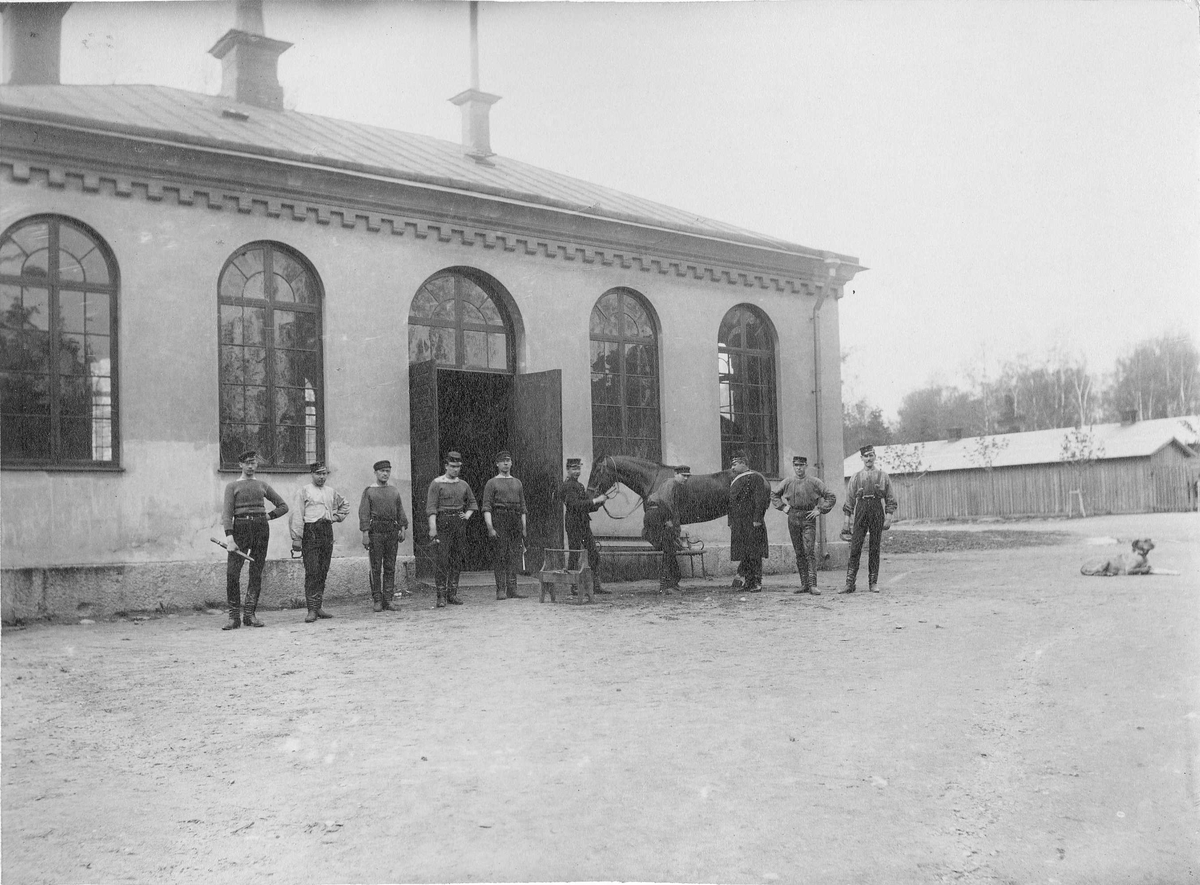 Män i arbetskläder och en häst poserar utan för Svea artilleriregemente A 1 stallbyggnad. Till höger om männen ligger en hund.