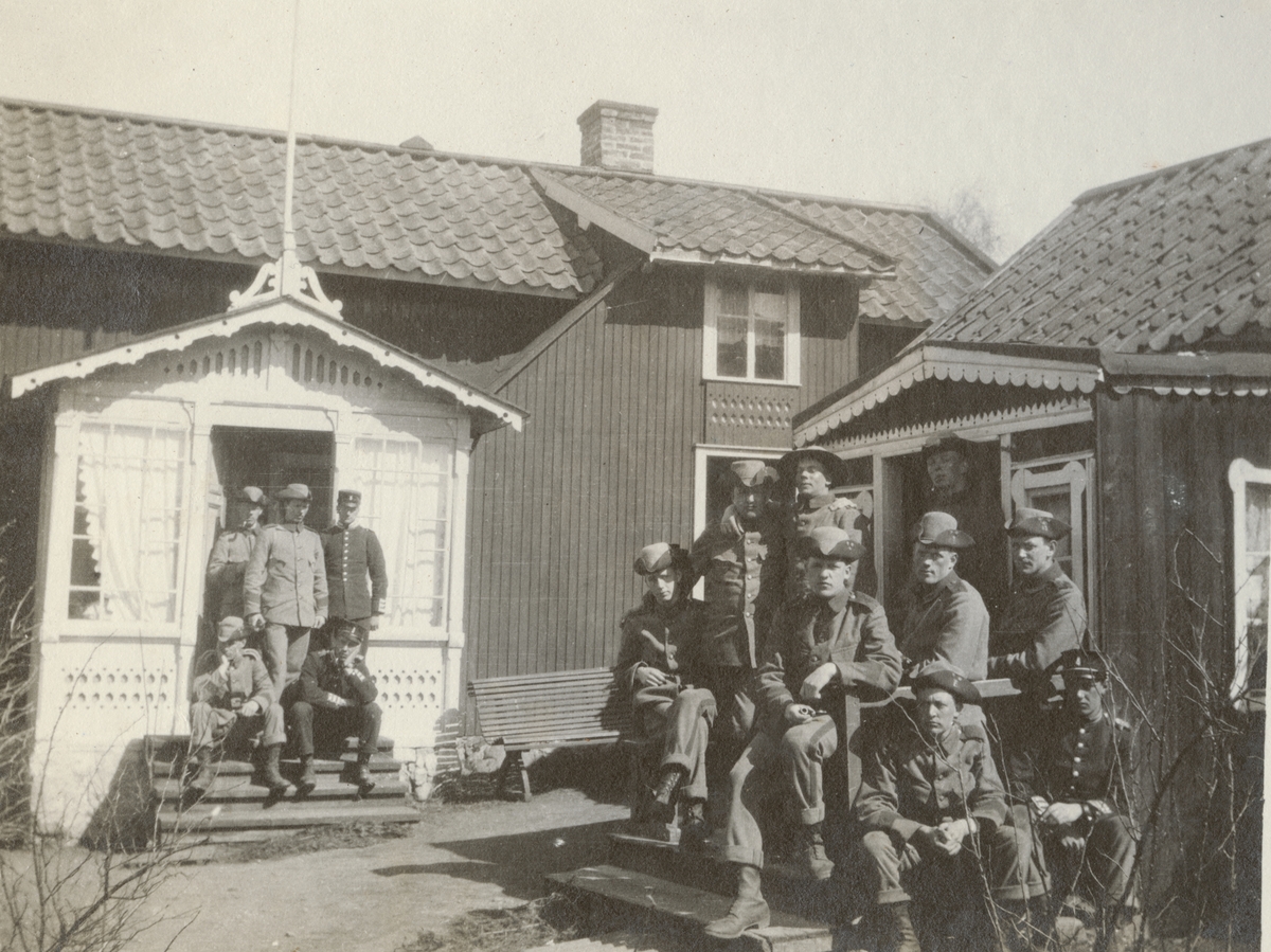 Titel: Gruppbild av soldater från Göta livgarde framför ett trähus.