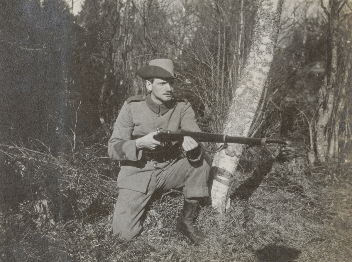 Titel: En soldat från Göta livgarde i beredskap med gevär.
