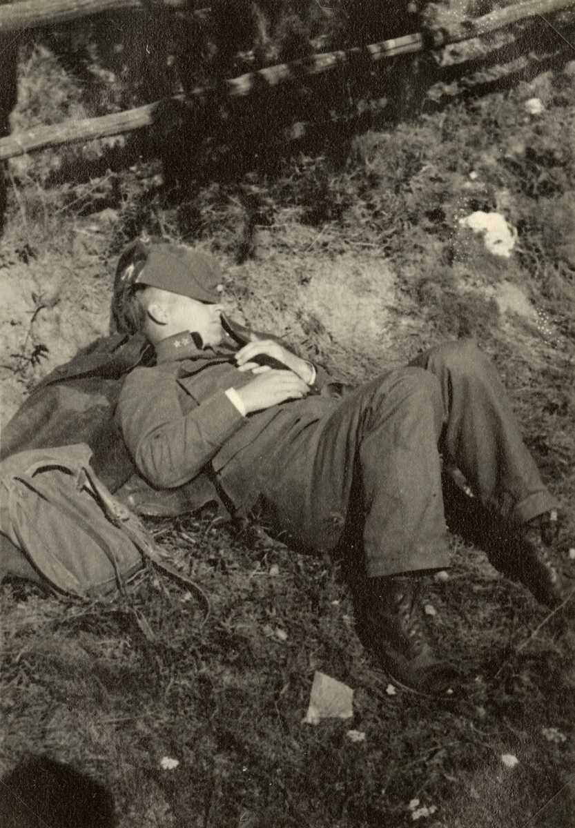 Titel: Text i fotoalbum: "Fältövningar i Hedemora 18.-24.8.1938. Berg sover som vanligt."