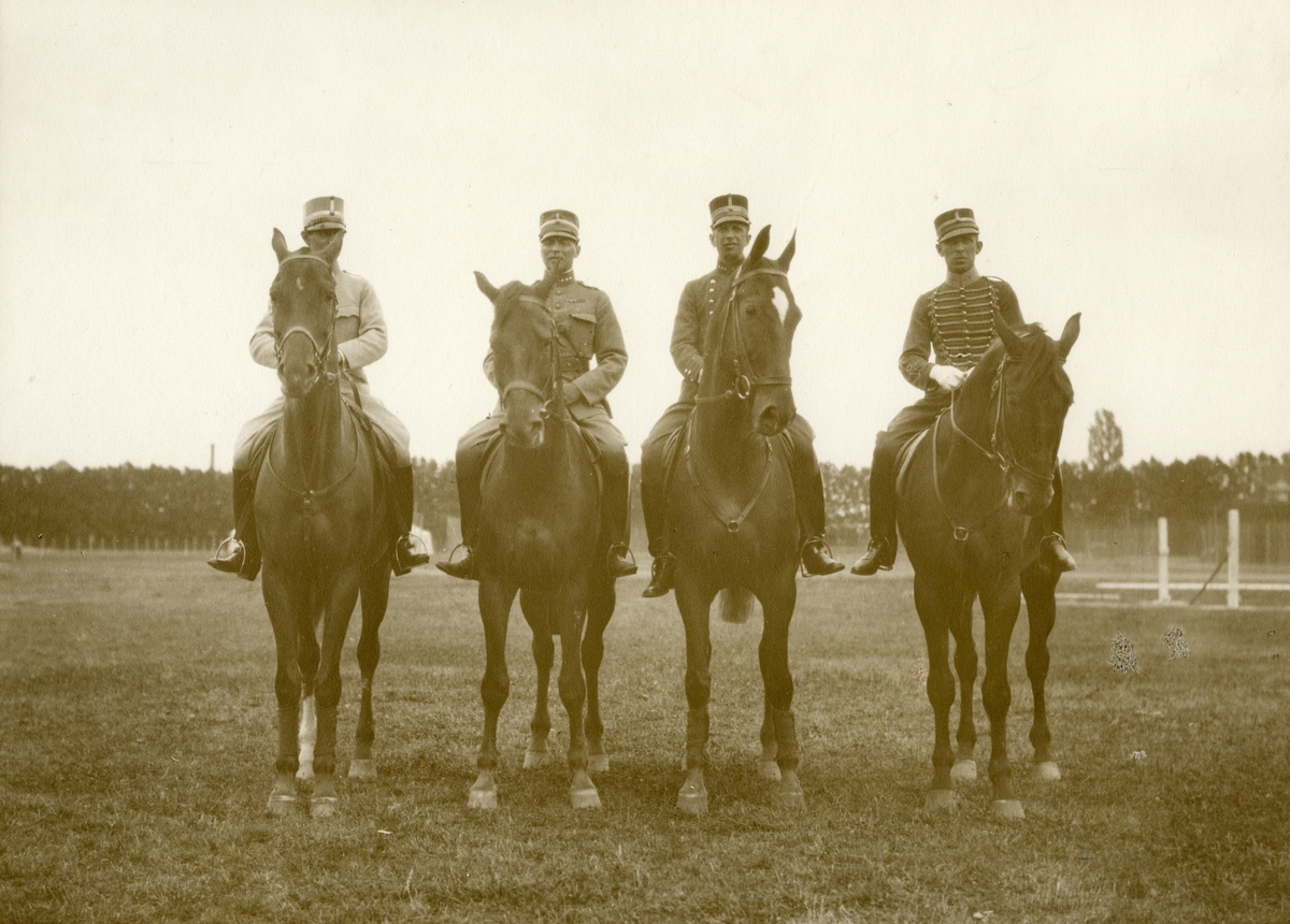Titel: Olympiatrupp på 4 ryttare till häst uppställda på hinderbana vid olympiaden i Paris 1924.