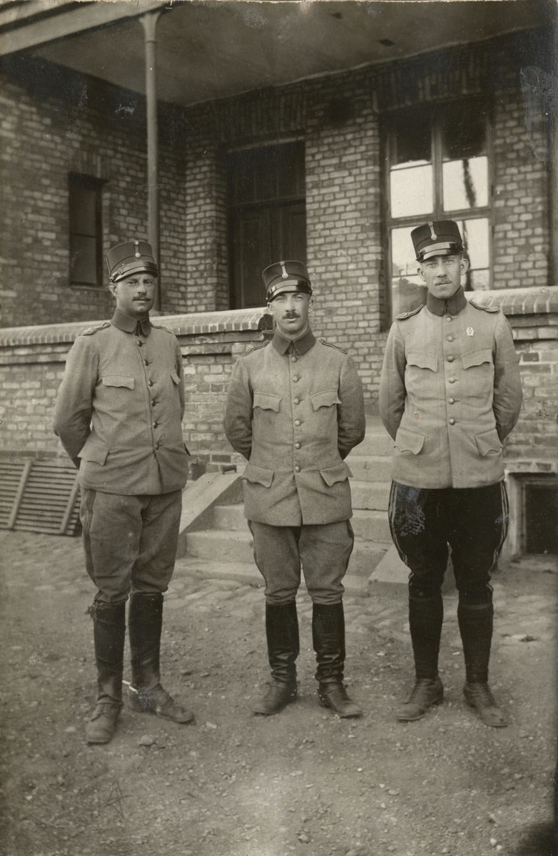 Titel: Gruppbild med soldater från Positionsartilleriregemente A 9 framför en byggnad.