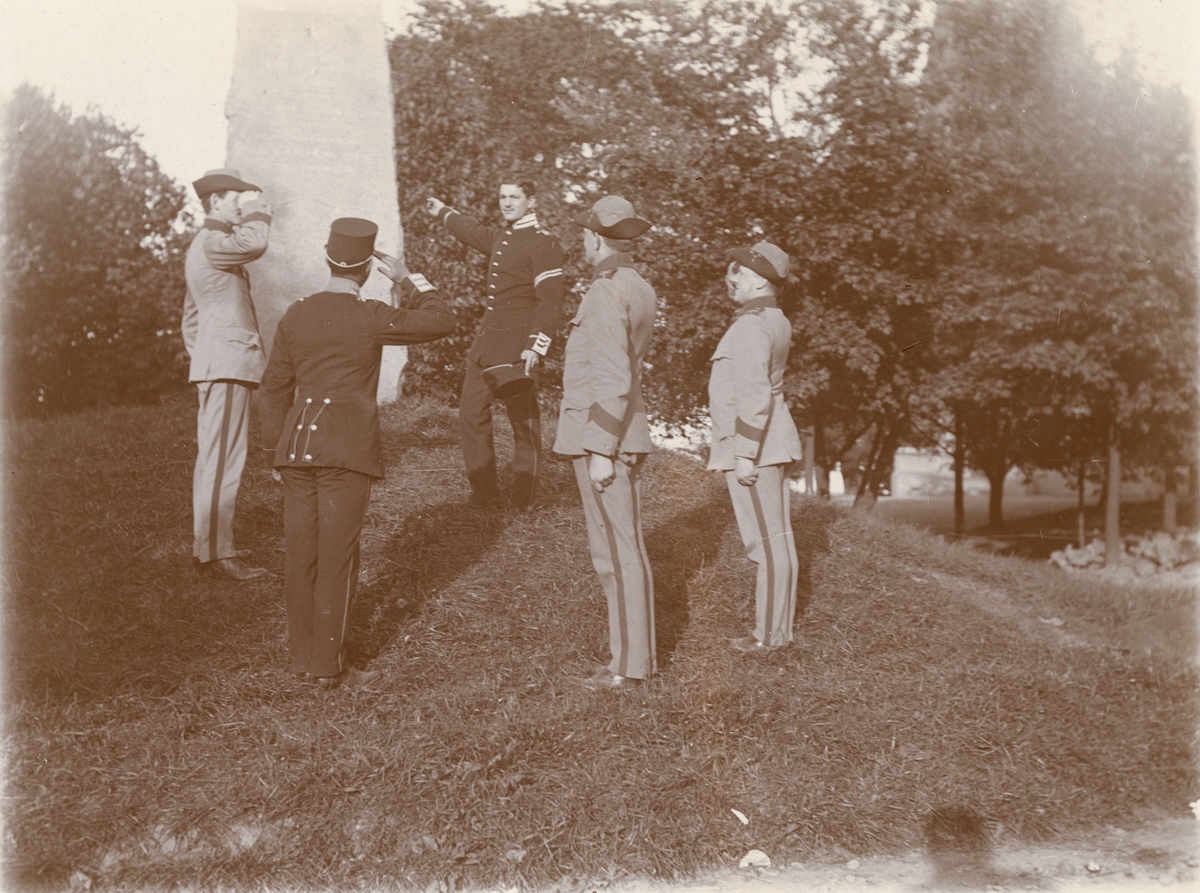 Titel: Soldater vid Göta livgarde I 2 framför Svea livgardes I 1 minnessten i Gustav Adolfsparken i Stockholm.