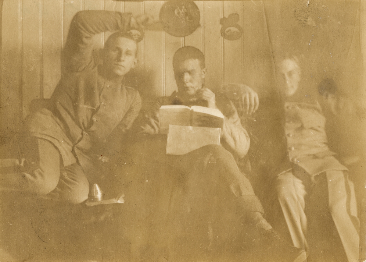 Titel: Text i fotoalbum: "Tre regementskamrater i "förbjudna rummet."