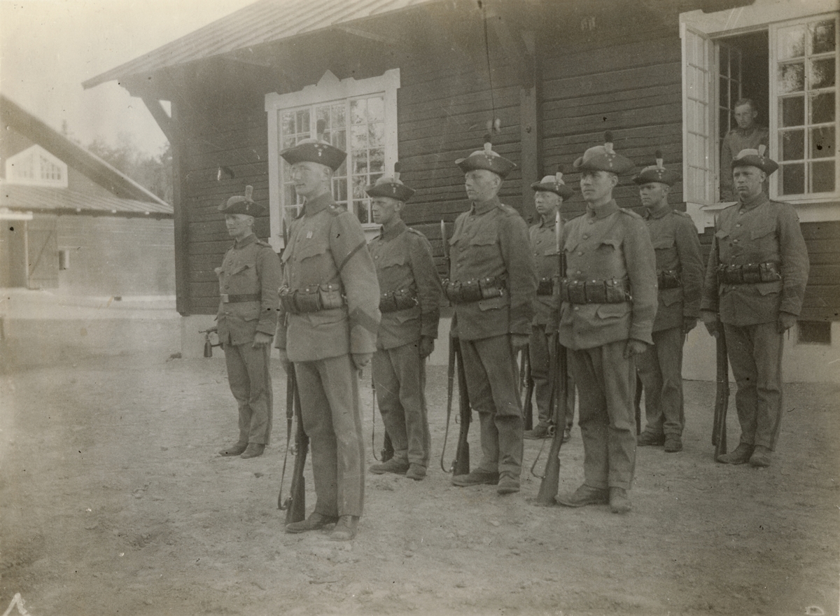 Titel: Text i fotoalbum: "Oscar Fredriksborg. Våren 1916. Kasernvakt."