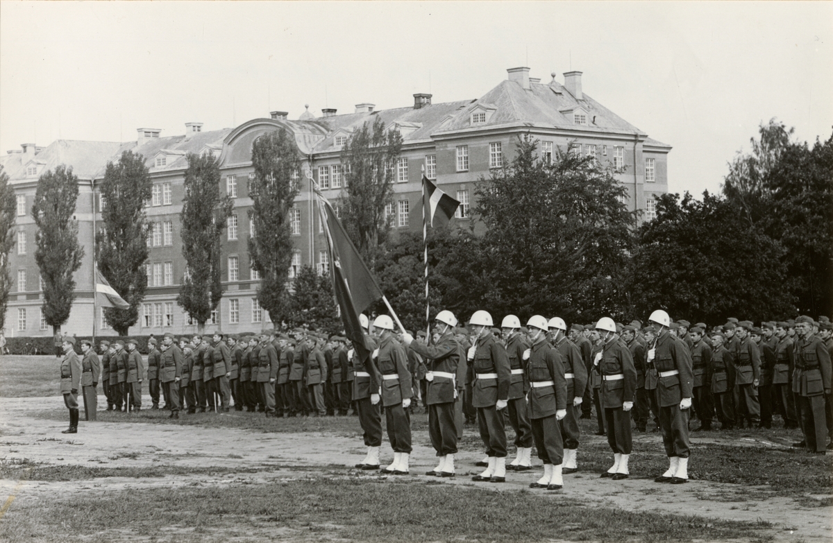Text i fotoalbum: "Regementsfanan med fanvakt "Regementets dag" september 1956. II bataljonen, chef: major A. Falk."
