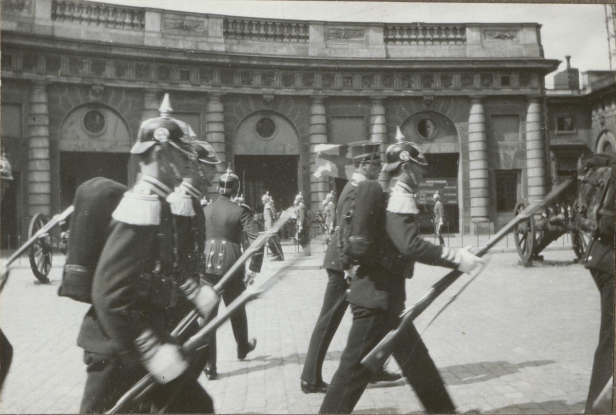 Titel: Högvakt på kungliga slottet i Stockholm. Göta livgardes stridsvagnsbataljon, 1928-1930, 1:a kursen.