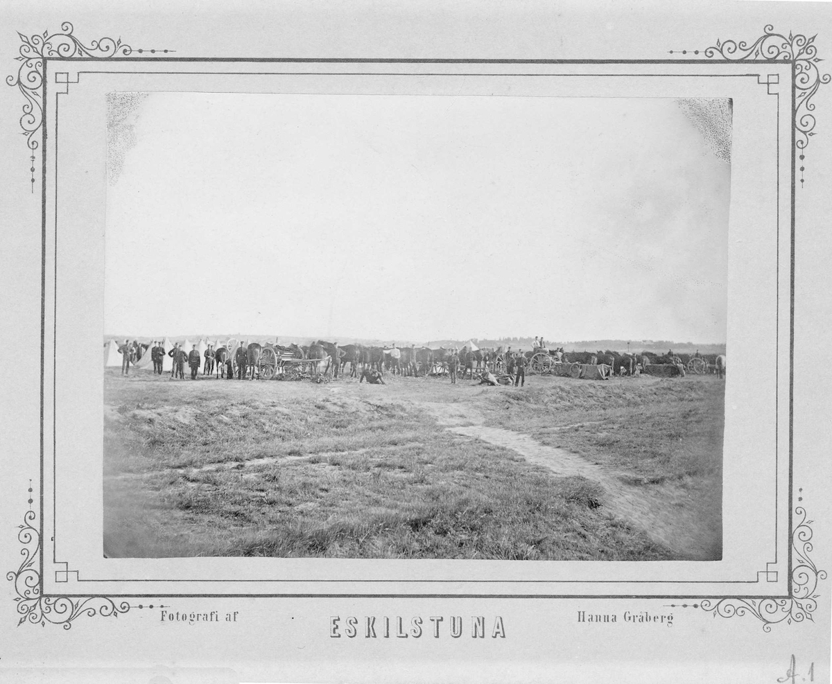 Svea artilleriregemente A 1 på Ladugårds gärde eller Marma skjutfält omkring. 1890-1900. I bakgrunden syns tältläger, hästar och artilleripjäser.