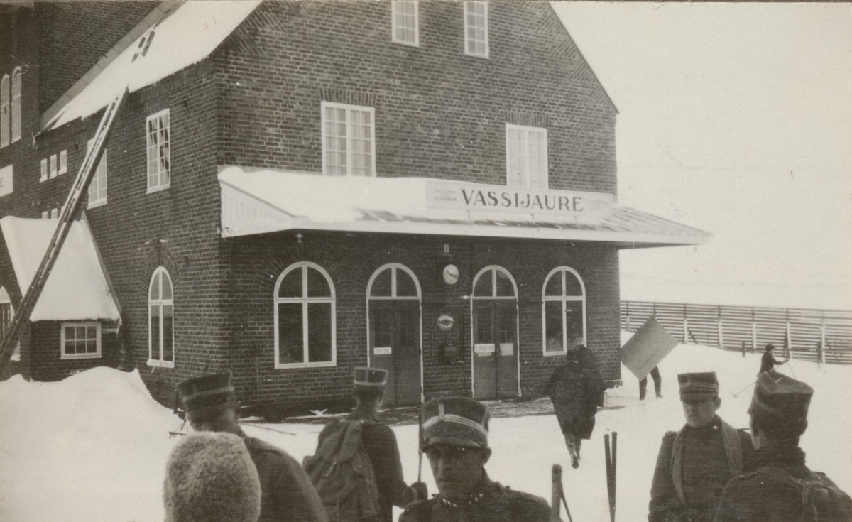 Titel: Soldater från Göta livgardes stridsvagnsbataljon utanför Vassijauri station i Lappland.