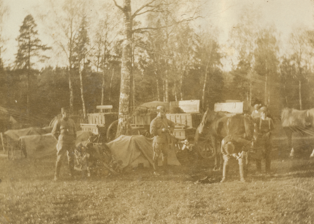 Titel: Trossvagnar och soldater från Positionsartilleriregemente A 9 i skogen. En häst förses med sko.
